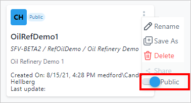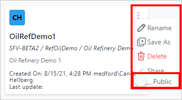 The quick menu disappears and the project shows a "Public" tag (as shown in the following image) indicating that all SFHub Studio users have full permissions on it.