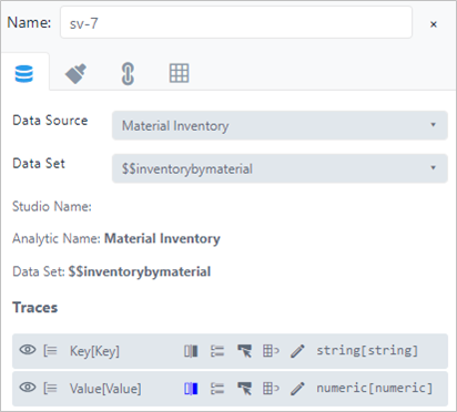 c. Click the Data Source box and choose the data source you want from the list. We choose 'Material Inventory' for our example. The Table visual object displays a preview of the columns returned by the selected Data Source (in our example you can see two columns because the selected Data Source is of type SFHub Dictionary).