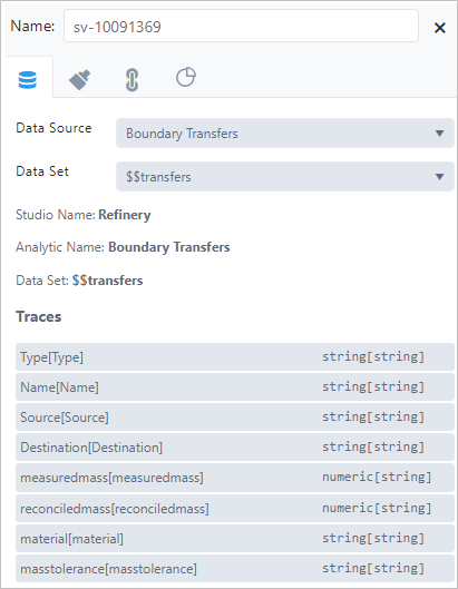 The Data Source panel allows you to configure the data source of the Chart visual object. The Traces section displays the list of the data columns returned by the Data Set allowed to configure the chart.