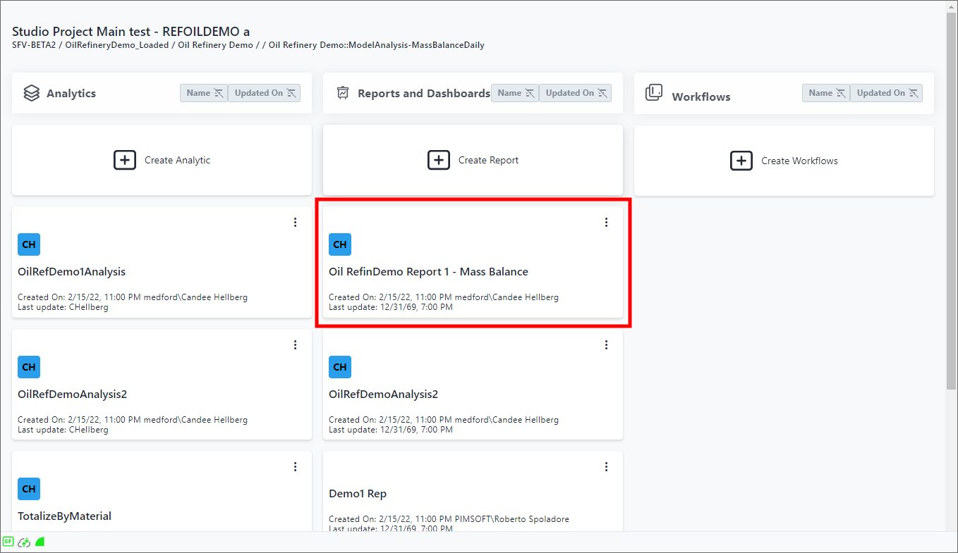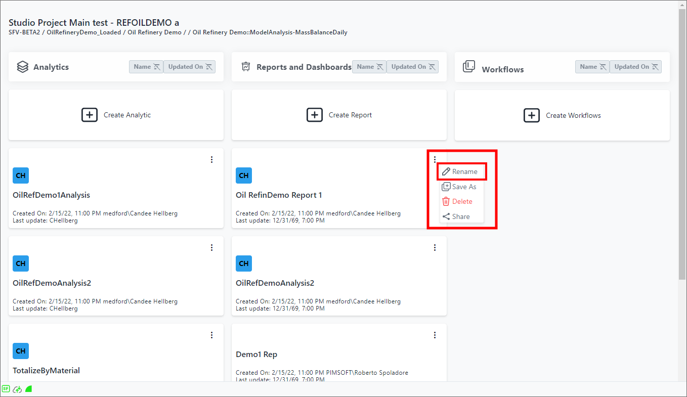 Click on the project that contains the report you want to rename. The Studio Project [name of selected project] dashboard opens. Studio Project [project name] dashboard