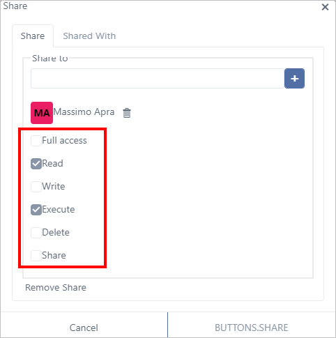 To assign Full Access to a person, do not check the Full Access checkbox; instead, check the checkbox under each permission (Read, Write, Delete and Share).