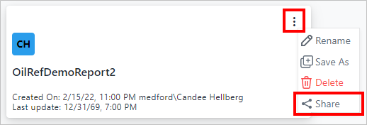 vertical ellipsis in the top-right corner of the report block, then choose Share (as shown in Figure 391).