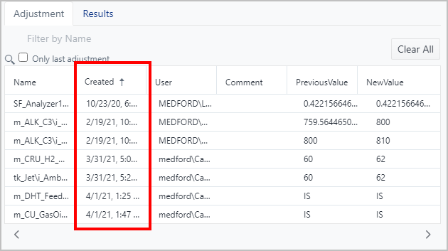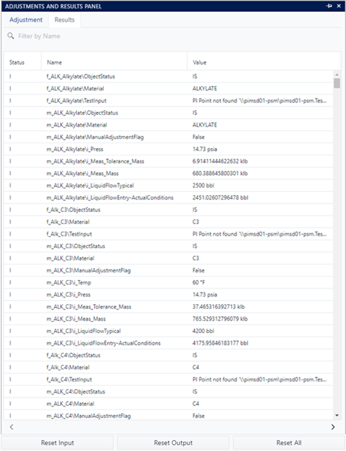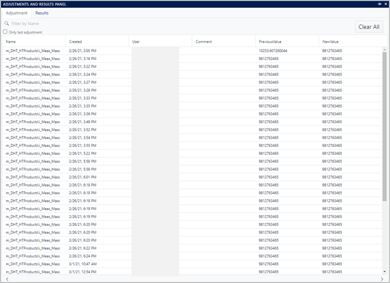 Both the Adjustment and Results lists can be filtered by name, to narrow the scope of the table to a subset of elements and attributes. Each Adjustment and Result name is composed of the element name followed by the '\' character and then the name of the attribute where the adjustment or the result has been created.