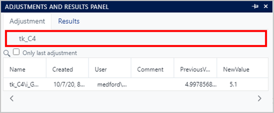 - If the filter by name contains the string 'tk_C4\i_', then all the adjustments or results created for the element named 'tk_C4' and the attributes whose name starts with 'i_' will be shown.