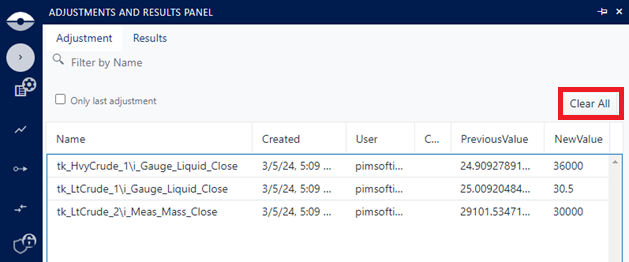 Adjustment and Results panel - Clear All