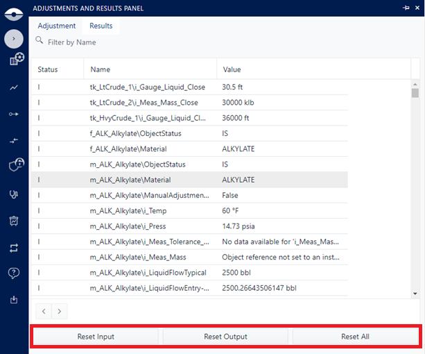 Adjustment and Results panel - Reset Results