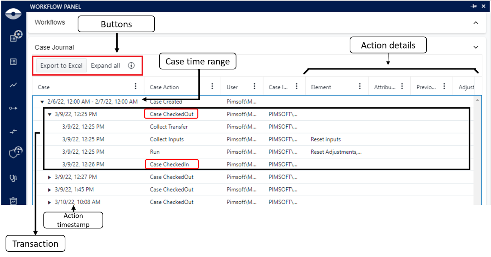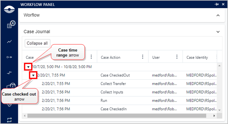 Click on a Case checked out arrow, to expand the actions on the Case at a specific date and time, by user.