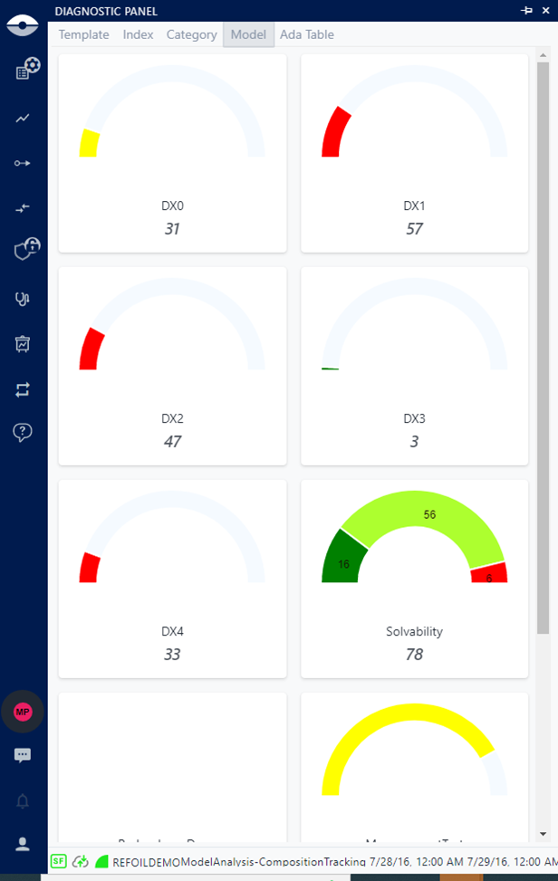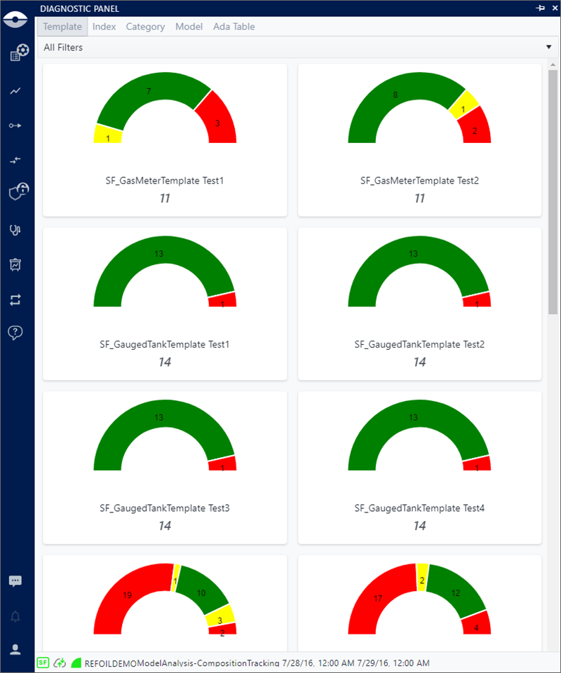 Each Diagnostic panel displays a colored graph split into segments, with each segment representing a minimum and maximum range of the Statistical Index, calculated by the analysis. Elements are associated with each segment according to the value of the Statistical Index. The graph, colors and minimum - maximum ranges are configurable under your user Settings. For more details see Attribute Settings under "User Settings".
