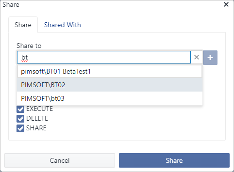 The Share tab is where you find and add the users you want to share the display with. As you begin typing the name of a user, all users with that character (or those characters) appear in a list.
