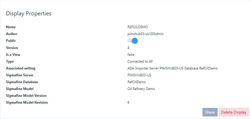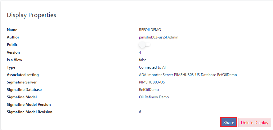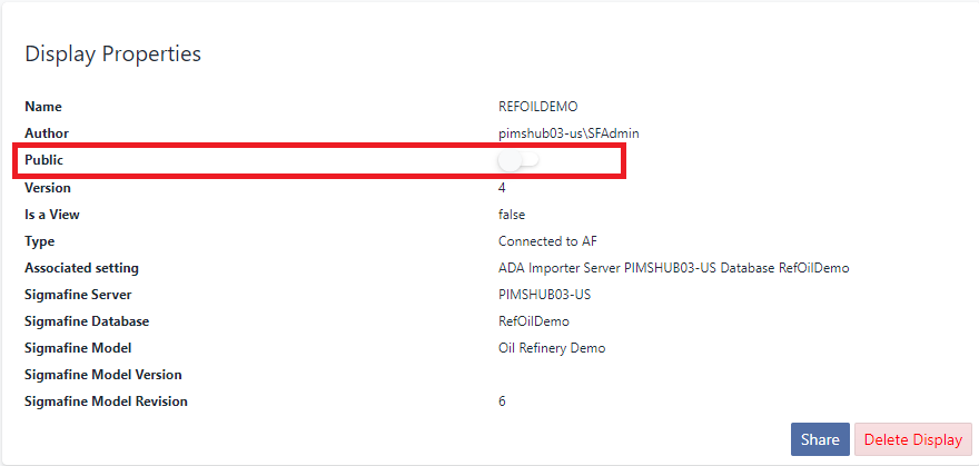 To share your display with every SigmafineHub user at your company, you use the 'Public' share feature. Once a display is Public, any SFHub user can view and work with the display in the SFHub Visualizer application.
