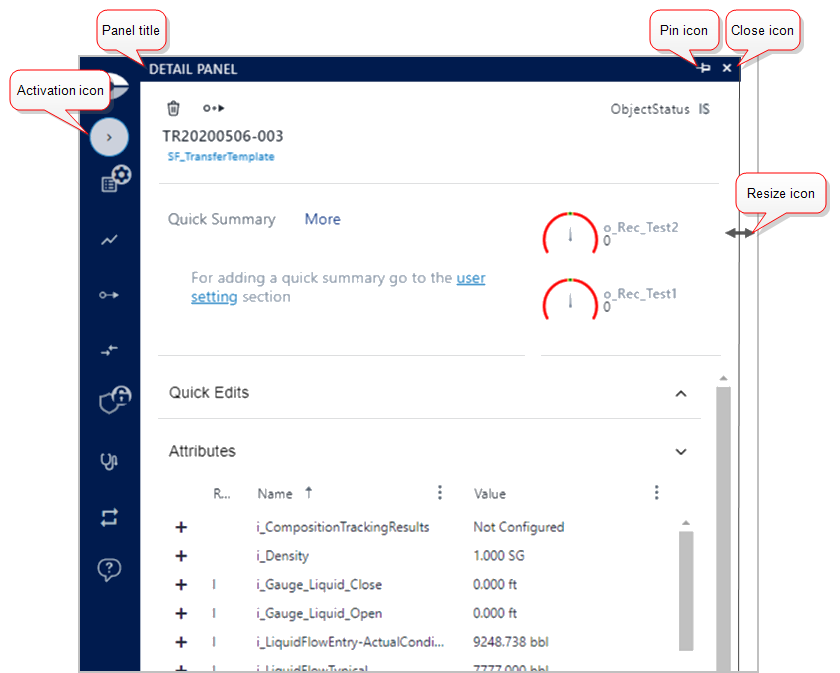 Detail Panel activation icon | The Activation icon collapses and expands the element Detail Panel. The Element Detail panel is generally activated automatically when a symbol on the display is selected. The activation icon on the command bar could be used when needed in case the panel has been closed. This icon is hidden as soon as a display has been opened and it will be visible as soon as an element has been selected on the display. When first clicked, the panel opens; when clicked a second time, the panel closes. Closing and reopening the panel triggers a refresh of the information. Once a panel is open, a click anywhere in the Display panel triggers it to close. |