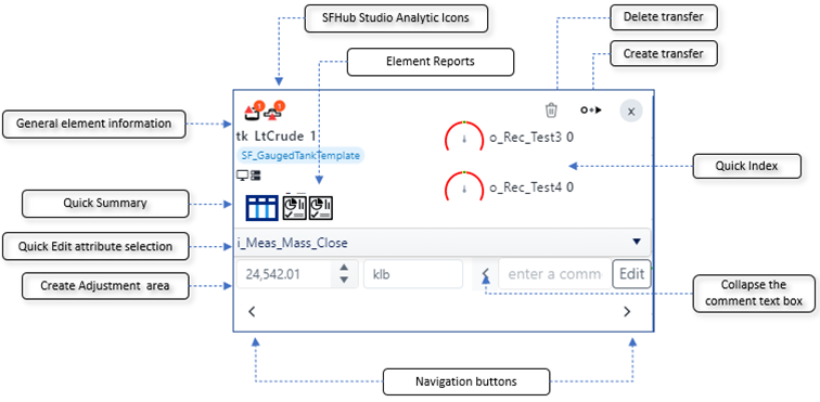 When hovering over a display element, aTool tip panel opens to display information about that element. In SFHub Visualizer, the tool tip is actually an active panel, where you can make most of the required actions. The following figure shows how the tool tip panel is organized.