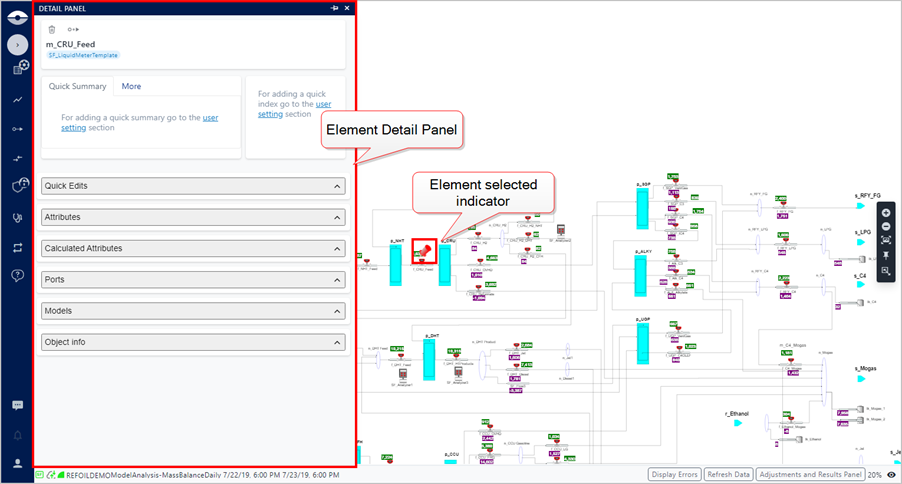 The Element Details panel opens and a red stick pin indicates the selected Element in the Display panel.