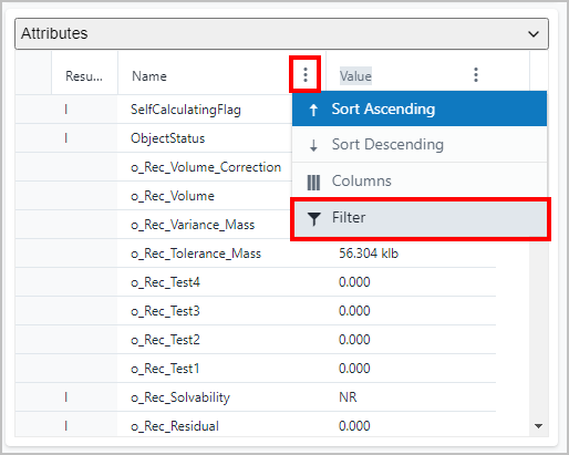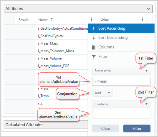To find a specific element, attribute or value in a table list, you can use the Filter option from the Column Menu.