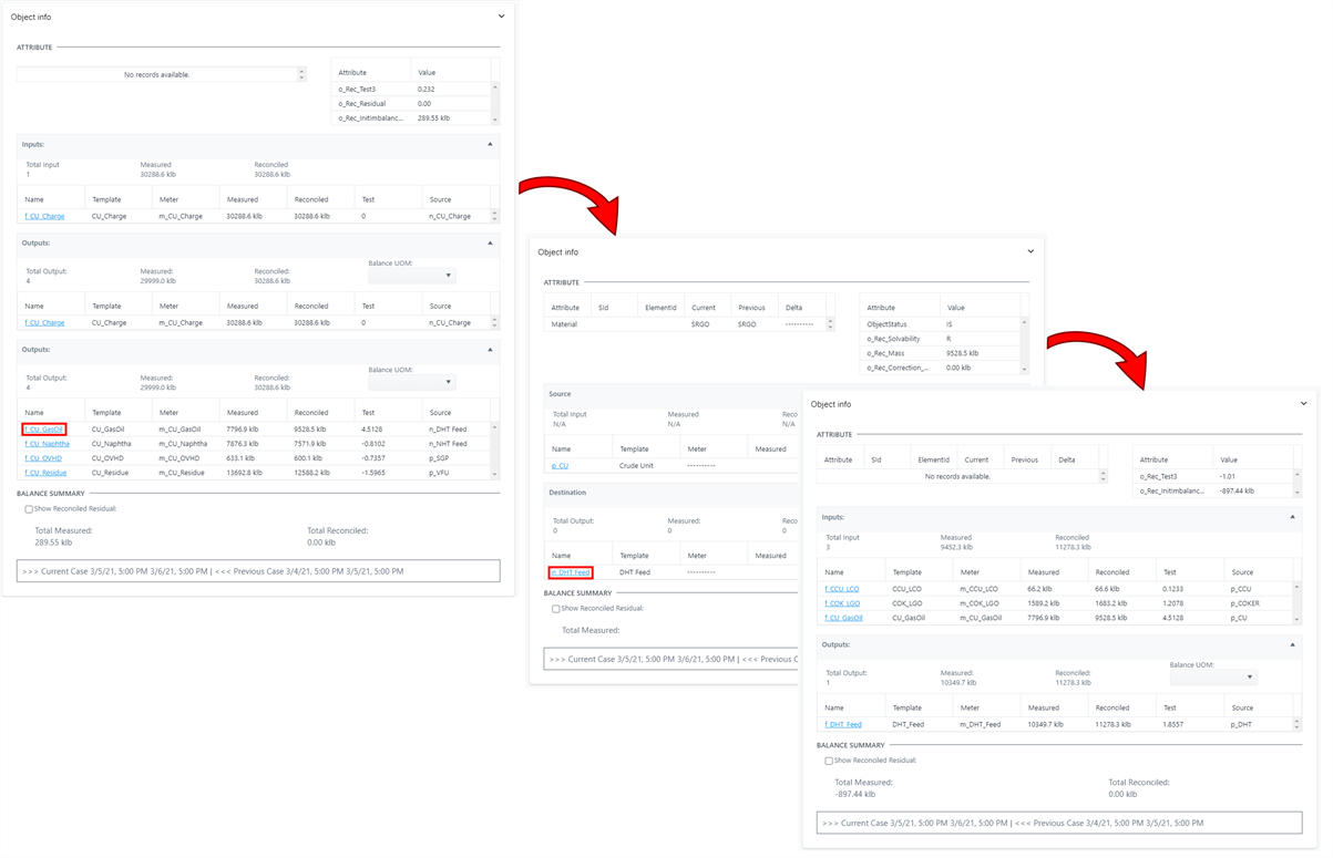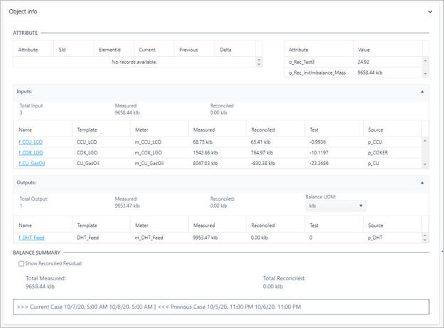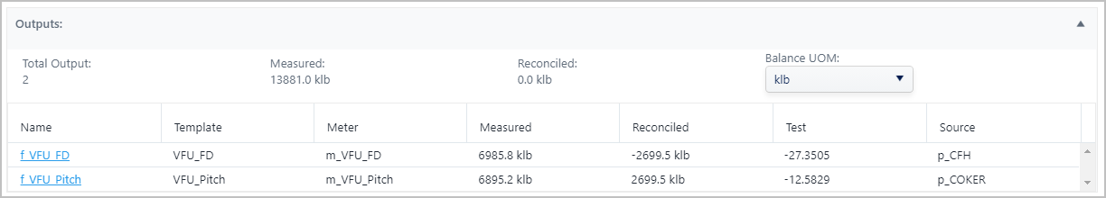 Outputs The Outputs section contains a table that shows the flows and transactions for point of balance objects (Processes, Nodes, Tanks) that are the outputs of the Element. Note: The Balance Data Unit of Measure defaults to the UOM configured on the reconciled imbalance attribute. You have the ability to change this UOM in the ADA Outputs sub-panel.