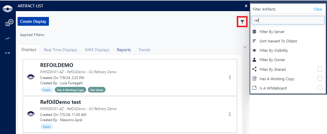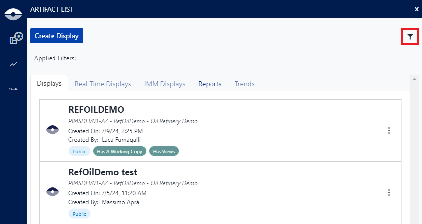SFHub Visualizer includes Search Filters that allow you to narrow the scope of the displays and reports shown in the Display List. The filter panel can be activated by selecting the filter icon on the display list.