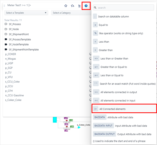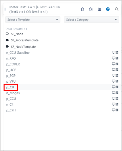 When you finish the search string, the results list changes to display all the elements that match your entry.