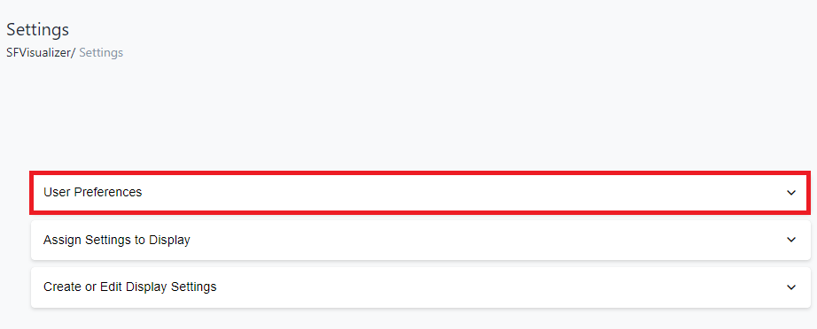 On the SFHub Visualizer Settings page, in the User Preferences panel, you can customize your own user preference settings that you can use to override the settings defined by the SFHub Administrator.