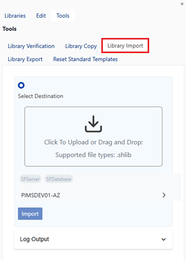 .sflibfile to be imported. - Select the Server and database where to import the library.